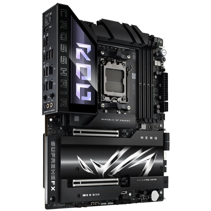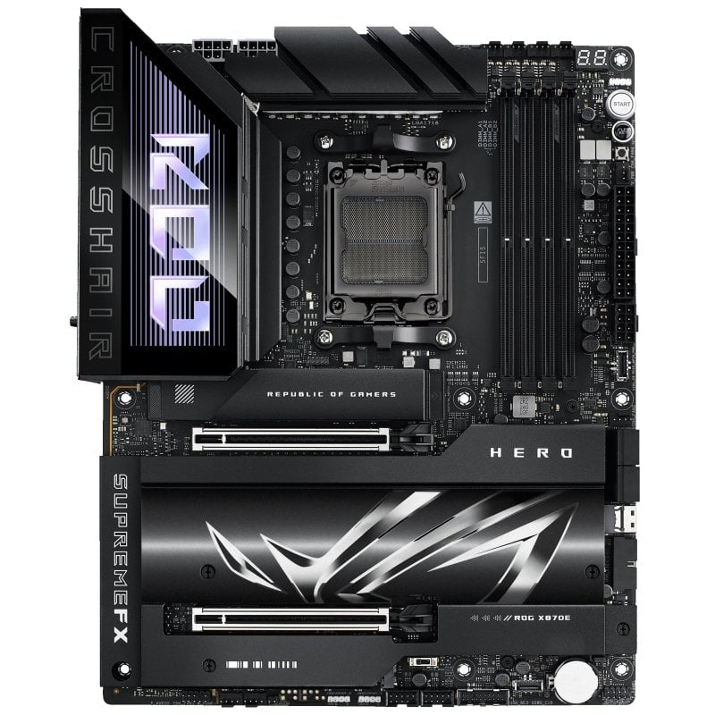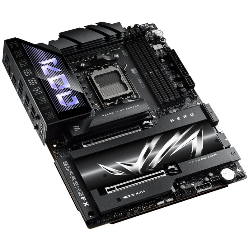 Placa base ASUS ROG CROSSHAIR X870E HERO PC-ready con IA avanzada, 18+2+2 fases de poder, Dynamic OC Switcher, Core Flex, ranuras DDR5 con AEMP y Tecnología DRAM NitroPath, Wi-Fi 7 con ASUS WiFi Q-Antenna, cinco puertos M.2 integrados, tres puertos SSD PCIe® 5.0 NVMe® integrados, conector SlimSAS, PCIe® 5.0 x16 SafeSlots con PCIe® Q-Release Slim, dos puertos USB4®, dos puertos USB 20Gbps Type-C® en el panel frontal (uno con Quick Charge 4+ hasta 60 W y USB Wattage Watcher), AI Overclocking, AI Cooling II, AI Networking II y Polymo Lighting II.