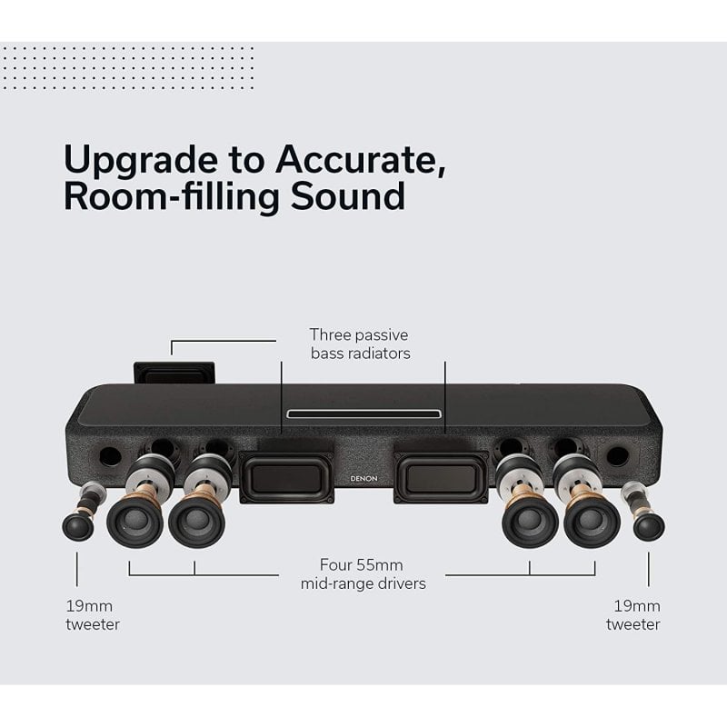 Potente sonido Denon Home con una barra de sonido compacta para televisión y música. Diseñada para ofrecer el sonido Denon 3D con Dolby ATMOS y DTS:X.