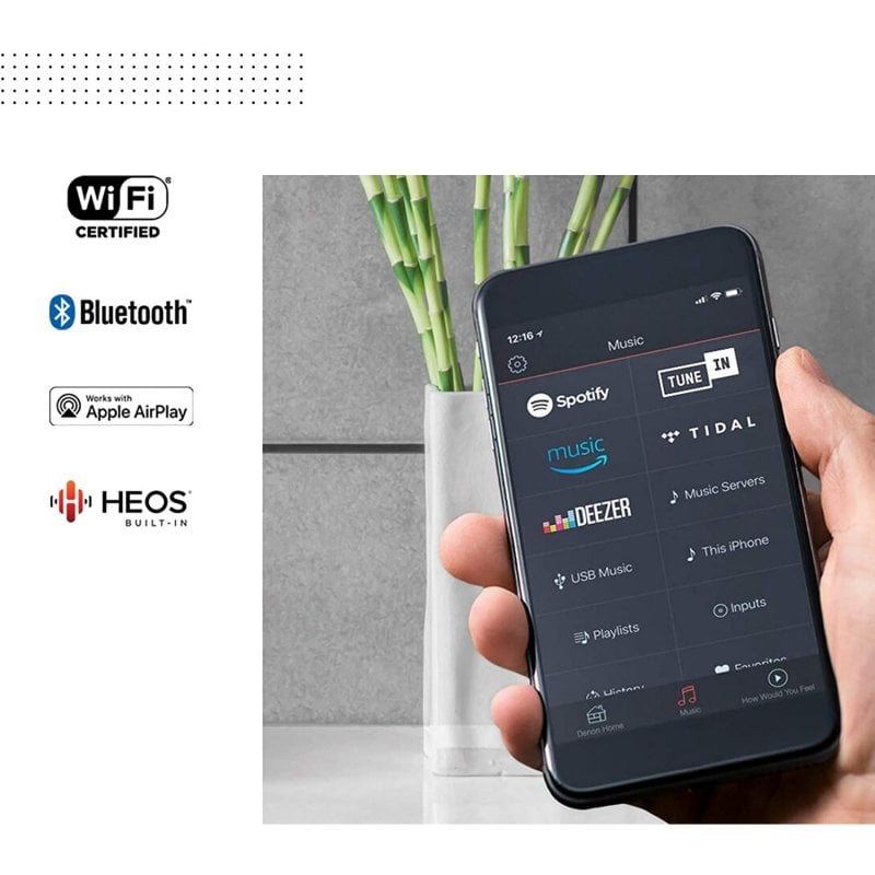 Puede sincronizarse con otros productos Denon Home y con HEOS integrado para reproducir música de alta resolución en toda la casa.