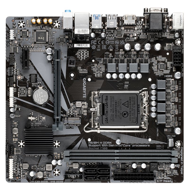 Placa base Intel® H610 con diseño VRM digital de 6+1+1 fases híbridas, diseño PCIe 4.0*, Gen3 x4 M.2, Intel® GbE con cFosSpeed, resistencia antisulfuro, Smart Fan 6