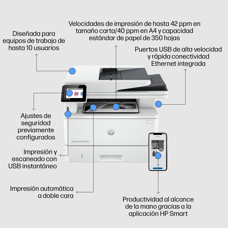 La impresora HP LaserJet Pro 4102dw se ha diseñado para ofrecer la máxima productividad gracias a la fiabilidad del hardware y a las rápidas velocidades que alcanza. Utilízala fácilmente desde donde trabajes para que puedas centrarte en tu actividad comercial.